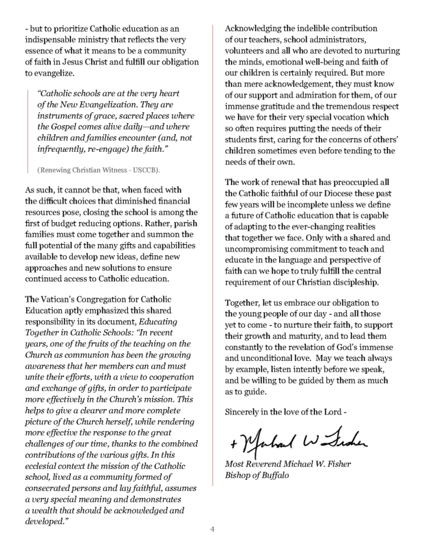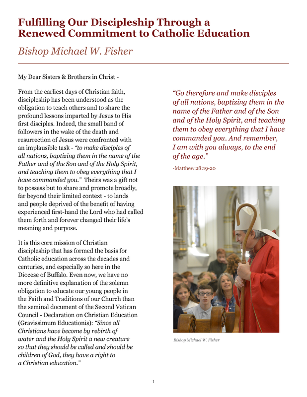“It is significant that Bishop Fisher has penned a pastoral letter – only his second since becoming the bishop of Buffalo – on Catholic education. As he points out, many of our current schools are enduring through challenging times, but he aptly points out that Catholic schools have a “special importance” among our ministries, and we all share a responsibility to see them succeed. The mission of Catholic schools (to provide Christian disciples) is especially important now."
