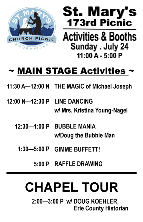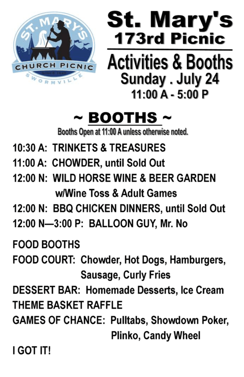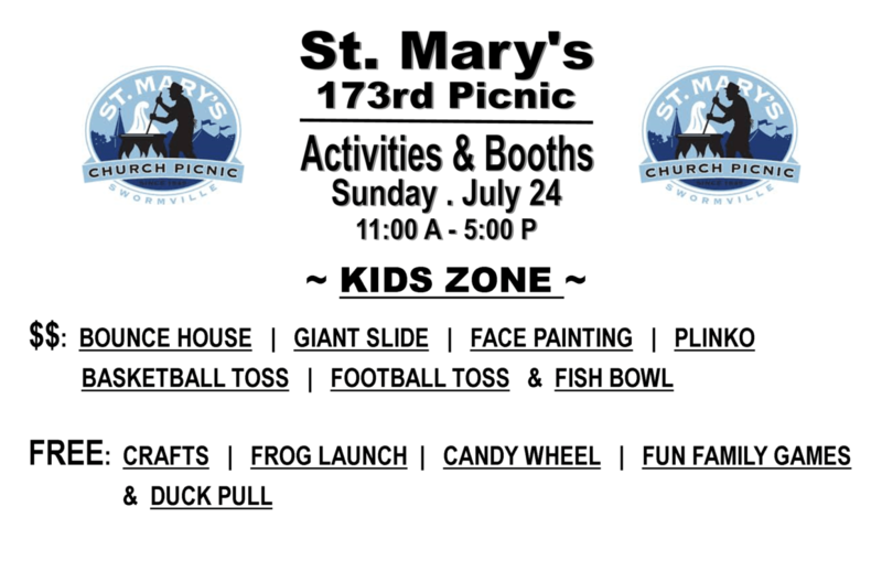 Vegetable Cutting: No sign up need! All are welcome to help cut up vegetables for St. Mary’s Homemade Chowder immediately following the outdoor 5:30 Mass. Bring your own peeler, knife, cutting board and large bowl.