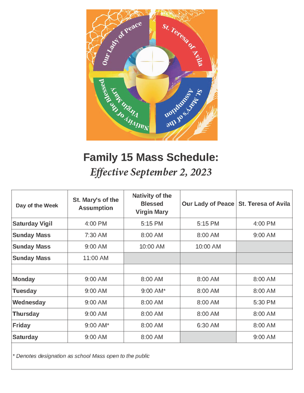 Centered on the Holy Eucharist, the source and summit of Catholic Christian life, our Family of Parishes' new schedule for Masses is effective this Saturday, September 2, 2023. Please keep this easy to read chart as a handy reference.