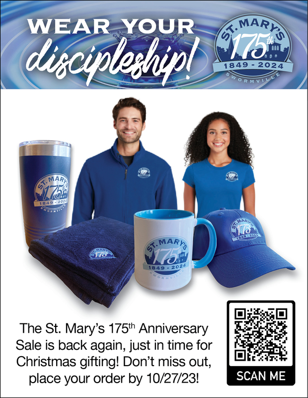 St. Mary's Parish will be celebrating our 175th Anniversary in 2024! Celebrate with commemorative apparel in youth and adult sizes as well as home goods. Our online store is open now through October 27th. Orders will arrive in time for Christmas gift giving.