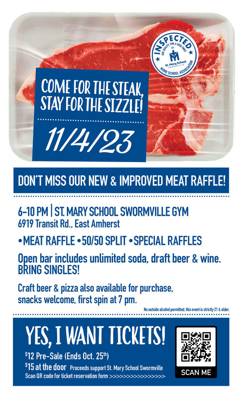 Save on pre-sale tickets until Oct. 25th, then the price per ticket goes up! Tables of 8 are also available. Be sure to see our ticket sellers on your way out of all St. Mary's weekend Masses on Oct. 21st and 22nd for pre-sale tickets, or download the ticket reservation form here, print and fill it out, and mail with check payable to “St. Mary School HSA”, or drop off at the Rectory or School, (6919 Transit Rd, East Amherst, NY 14051) by 10/25/23.